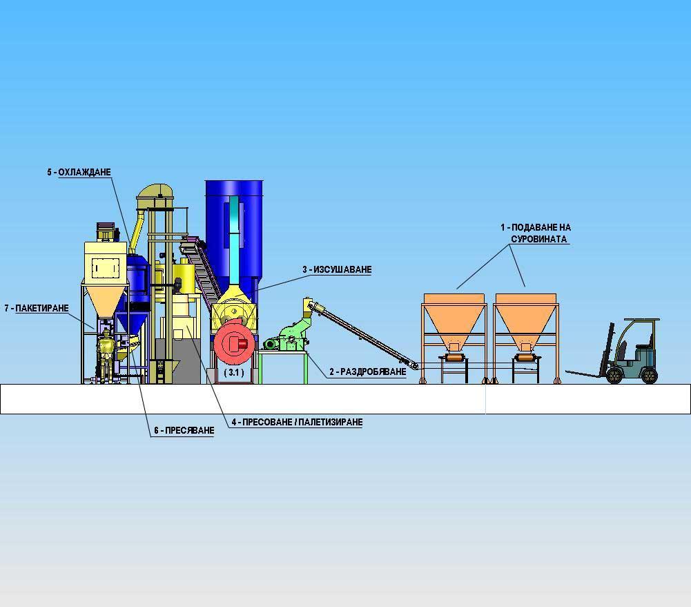 Последователност в технологията при производството на пелети Q = 1 t/h Подаване на суровината – (1) Раздробяване – (2) Изсушаване – (3) Пресоване / пелетизиране – (4) Охлаждане – (5) Пресоване – (6) Пакетиране – (7)